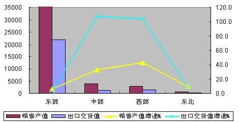 1-7月,东部地区实现销售产值和出口交货值为38150和22045亿元,增长6.3%和3.2%,分别低于行业平均水平3.9和5.8百分点。