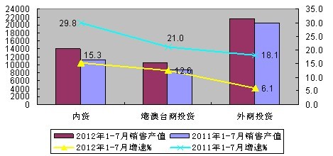 7月,港澳台资企业实现销售产值和出口交货值分别增长5.3%和10.2%,比6月分别下降11.6和16.3个百分点;内资企业实现销售产值和出口交货值分别增长15.8%和14.1%,高出全国平均水平8.4和10个百分点;外商投资企业持续低迷,生产、出口增速均不足7%。1-7月,内资企业实现销售产值13962亿元,同比增长15.3%,占全国比重30.4%。其中私营企业实现销售产值5101亿元,增长18.5%,高出行业平均水平8.3个百分点;外商投资企业销售产值、出口交货值分别增长6.1%和4.6%,低于行业平均水平4.1和4.4个百分点;港澳台资企业实现销售产值10467亿元,增长12.6%。