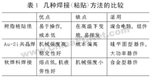 金属合金焊接法主要指金硅、金锗、金锡等共晶焊接。这里主要以金硅共晶焊为例加以讨论。金的熔点为1063℃,硅的熔点为1414℃,但金硅合金的熔点远低于单质的金和硅。从二元系相图中可以看到,含有31%的硅原子和69%的金原子的 Au-Si共熔体共晶点温度为370℃。这个共晶点是选择合适的焊接温度和对焊接深度进行控制的主要依据。金硅共晶焊接法就是芯片在一定的压力下(附以摩擦或超声),当温度高于共晶温度时,金硅合金融化成液态的Au-Si共熔体;冷却后,当温度低于共晶温度时,共熔体由液相变为以晶粒形式互相结合的机械混合物—— 金硅共熔晶体而全部凝固,从而形成了牢固的欧姆接触焊接面。共晶焊接法具有机械强度高、热阻小、稳定性好、可靠性高和含较少的杂质等优点,因而在微波功率器件和组件的芯片装配中得到了广泛的应用并备受高可靠器件封装业的青睐,其焊接强度已达到 245MPa[4]。金属合金焊接还包括“软焊料”焊接(如 95Pb/5Sn,92.5Pb/5In/2.5Ag),由于其机械强度相对较小,在半导体器件芯片焊接中不太常用。以下是几种焊接(粘贴)方法的比较,如表1所示。
