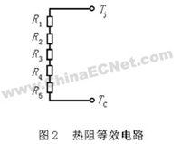 半导体器件的散热有辐射、对流和传导三种方式,其中热传导是其散热的主要方式。以硅微波功率晶体管为例,图1是硅微波功率管装配模型,图2是其热等效电路。其中Tj为管芯结温,TC为管壳温度;R1、R2、R3、R4、R5分别是芯片、Au-Si焊接层、BeO、界面焊料层和钨铜底座的热阻。总热阻R=R1+R2 +R3+R4+R 5。芯片集电结产生的热量主要通过硅片、焊接层、BeO传到WCu外壳。 Au-Si焊接层的虚焊和空洞是造成欧姆接触不良的主要原因,空洞会引起电流密集效应,在它附近有可能形成不可逆的,破坏性的热电击穿,即二次击穿 [5]。焊接层的欧姆接触不良给器件的可靠性带来极大隐患。