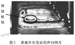 超声波检测方法的理论依据是不同介质的界面具有不同的声学性质,反射超声波的能力也不同。当超声波遇到缺陷时,会反射回来产生投射面积和缺陷相近的“阴影”。对于采用多层金属陶瓷封装的器件,往往需对封装体进行背面减薄后再进行检测。同时,由于热应力而造成的焊接失效,用一般的测试和检测手段很难发现,必须要对器件施加高应力,通常是经老化后缺陷被激活,即器件失效后才能被发现。图5是某失效器件经背面减薄后的声扫照片,黑色圈内部分为焊接缺陷。借助超声波能够精确地检测出焊接区域内缺陷的位置和大小。