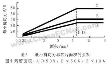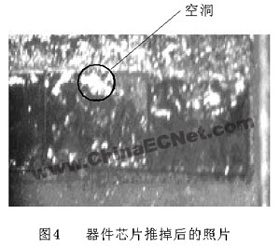 这是检验芯片与基片间焊接质量最常用和直观的方法。图3是用来检测芯片焊接的GJB548A -96的最小剪切力与芯片面积的关系。在焊接良好的情况下,即使芯片推碎了,焊接处仍然留有很大的芯片残留痕迹。一般焊接空洞处不粘附芯片衬底材料,芯片推掉后可直接观察到空洞的大小和密度。图4是某器件芯片推掉后观察到的焊接空洞照片。