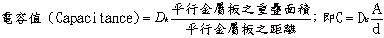 由上左图可知 MLB 中,其讯号线层与大地层两平行金属板之间,夹有绝缘介质(即胶片之玻纤与环氧树脂)时,在讯号传输工作中(也有很小的电流通过)将会出现一种电容器( Capacitor )的效应,其公式如下: