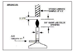 本项目的做法,可按 UL-94 或 NEMA LI1-1989 ,不过 IPC-TM-650 之 2.3.10 法却是引用前者。其无铜试样之尺寸为: 5 吋 X5 吋(厚度视产品而不同),每次做 5 样,每样试烧两次。试烧用之本生灯高 4 吋,管口直径 0.37 吋,所用瓦斯可采天然气,丁烷,丙烷等均可,但每 ft3 须具有 1000BTU 的热量。若出现争议时,则工业级的甲烷气( Methane )可作为标准燃料。