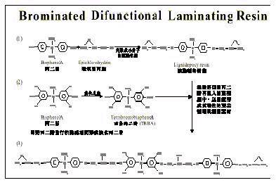 一般性环氧树脂,是由丙二酚( Bisphenol A )与环氧氯丙烷( Epichloro Hydrin )二者所聚合而成,并不具难燃性( Flame Retardent ),无法符合 UL-94 的规定。但若将“丙二酚”先行溴化反应,而改质成为“四溴丙二酚”,再混入液态环氧树脂( A-stage ),使其溴含量之重量比达 20 ﹪以上时,即可通过 UL-94 起码之 V-1 规定,而成为难燃性的 FR-4 了。