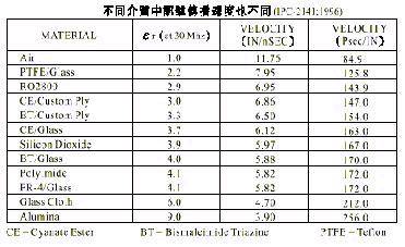 此式若用在空气之场合时(ε r = 1 ),此即说明了空气中的电波速率等于光速。但当一般多层板面上讯号线中传输“方波讯号”时(可视为电磁波),须将 FR-4 板材与绿漆的ε r ( Dk )代入上式,其速率自然会比在空气中慢了许多,且ε r 愈高时其速率会愈慢。